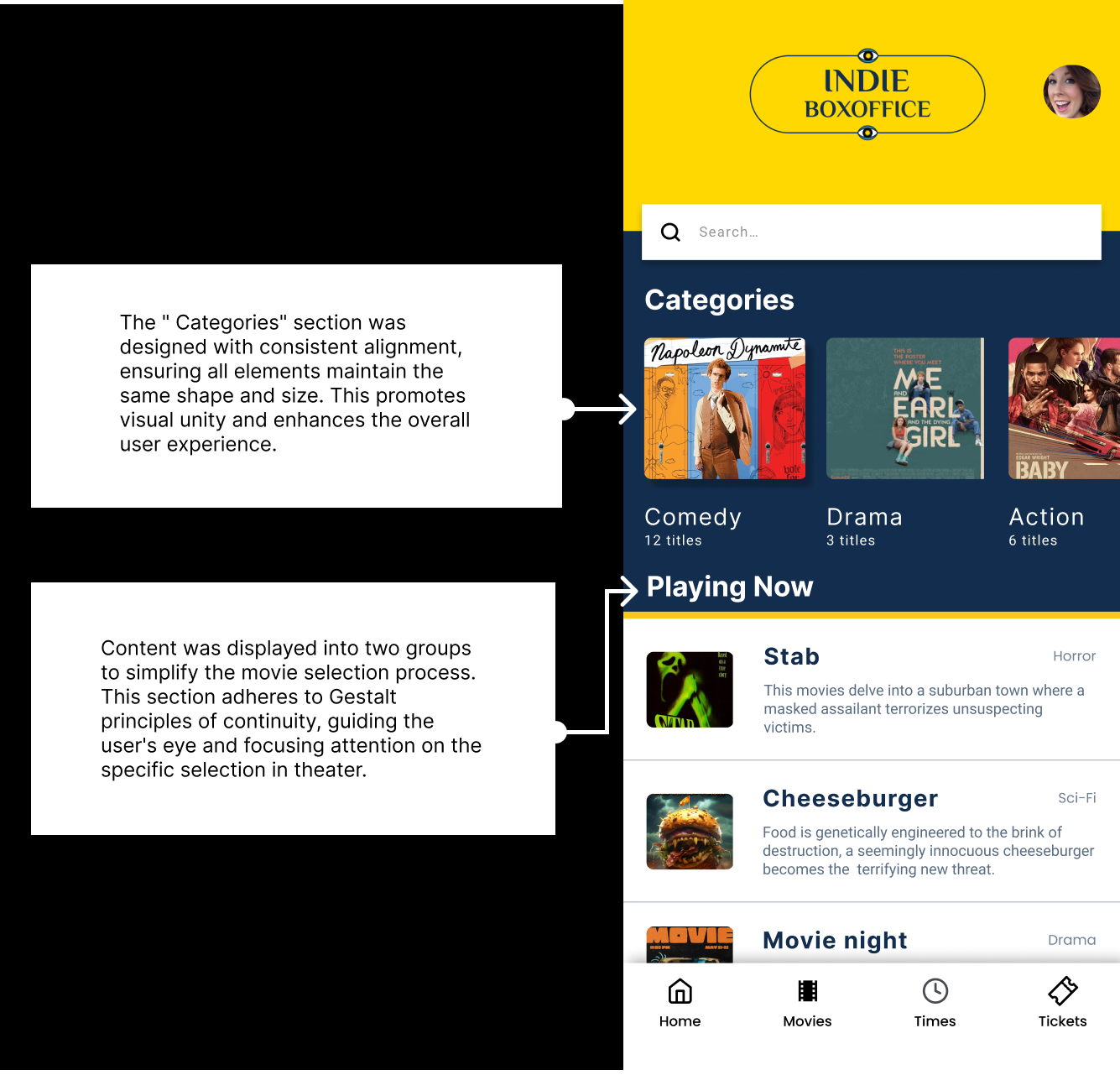 Testing was important for Indie Box Office to refine its ability to help with quick decision-making, the app should offer a clean, clutter-free design with clear visual cues. This minimizes confusion and enhances the efficiency of the booking process, making it easy to select movies, view seat availability, and make reservations.