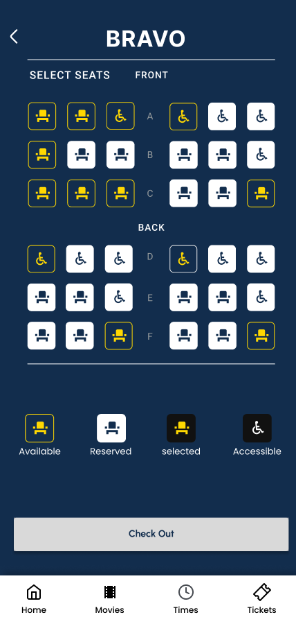 Using feedback from the Mid fidelity testing a Hi-fidelity prototype was created. The focus was to rework common issues users encountered in Movie selection, Show time and date information, and Accessible seating.