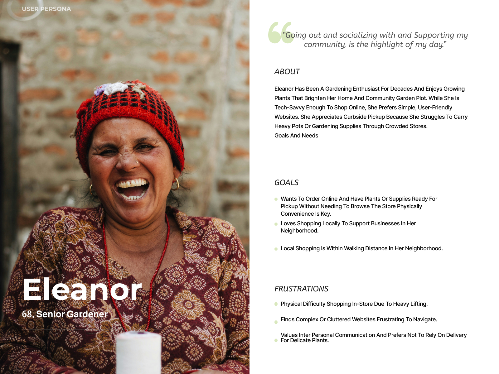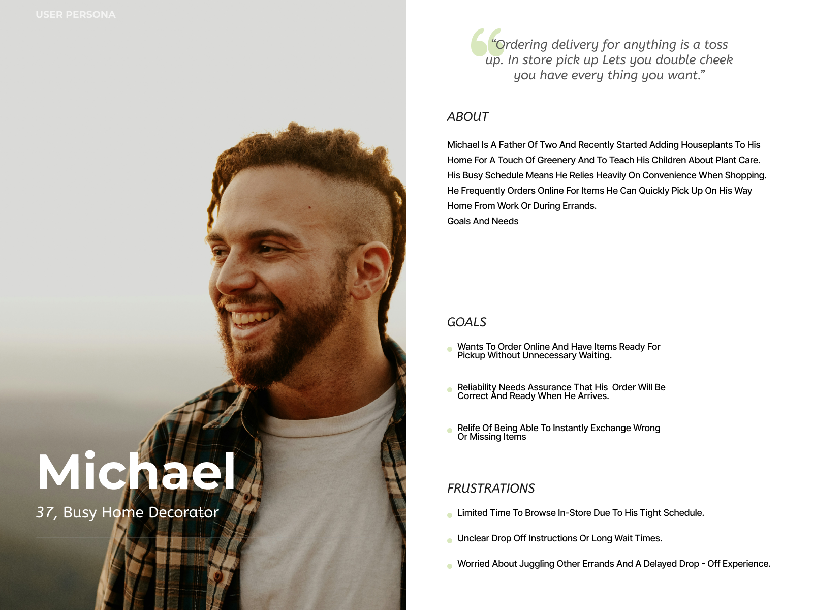 Both Eleanor and Michael’s personas highlight the importance of convenience, reliability, and simplicity in the online shopping experience, but each brings unique insights based on their different lifestyles and priorities. Together, these personas help illustrate a broader customer need for time-saving, user-friendly, and dependable experiences, especially in the context of online ordering and in-store pickup.